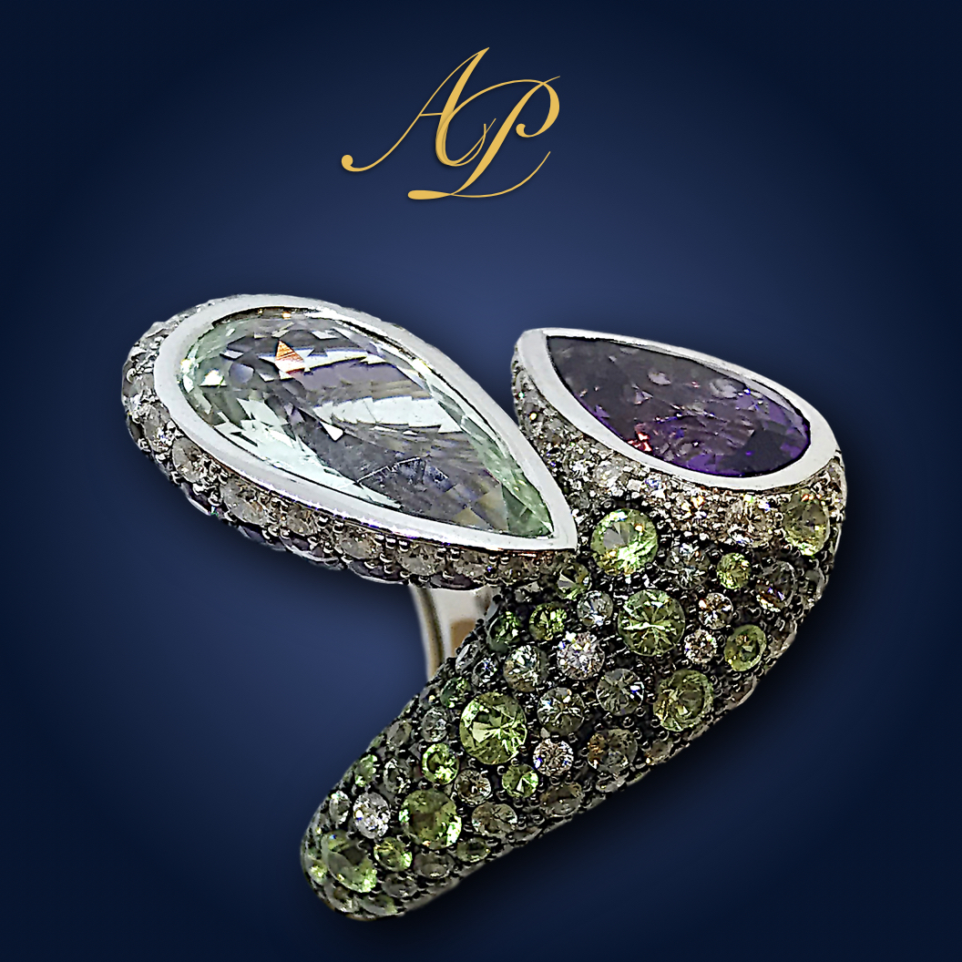 18cts impressive white gold ring with amethyst, excellent green beryl, diamonds and tsavorites.