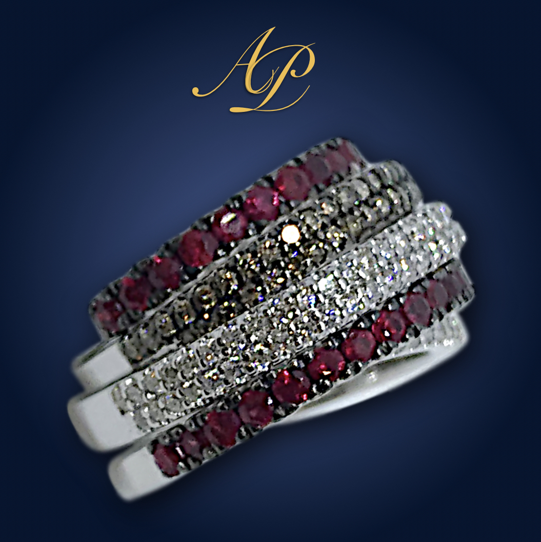 Crossed ring with rubies, brilliants and brown diamonds made in white gold.