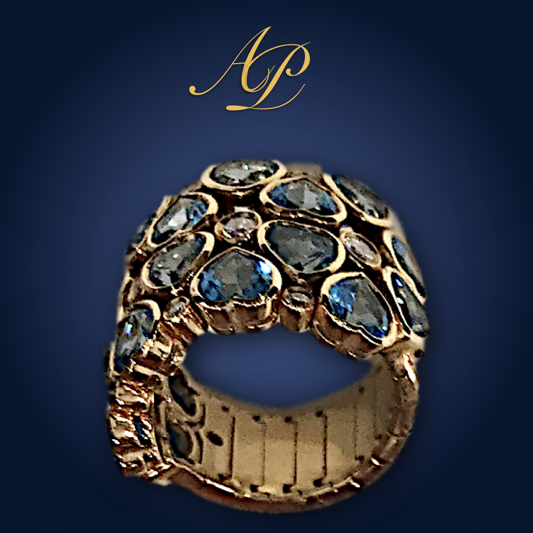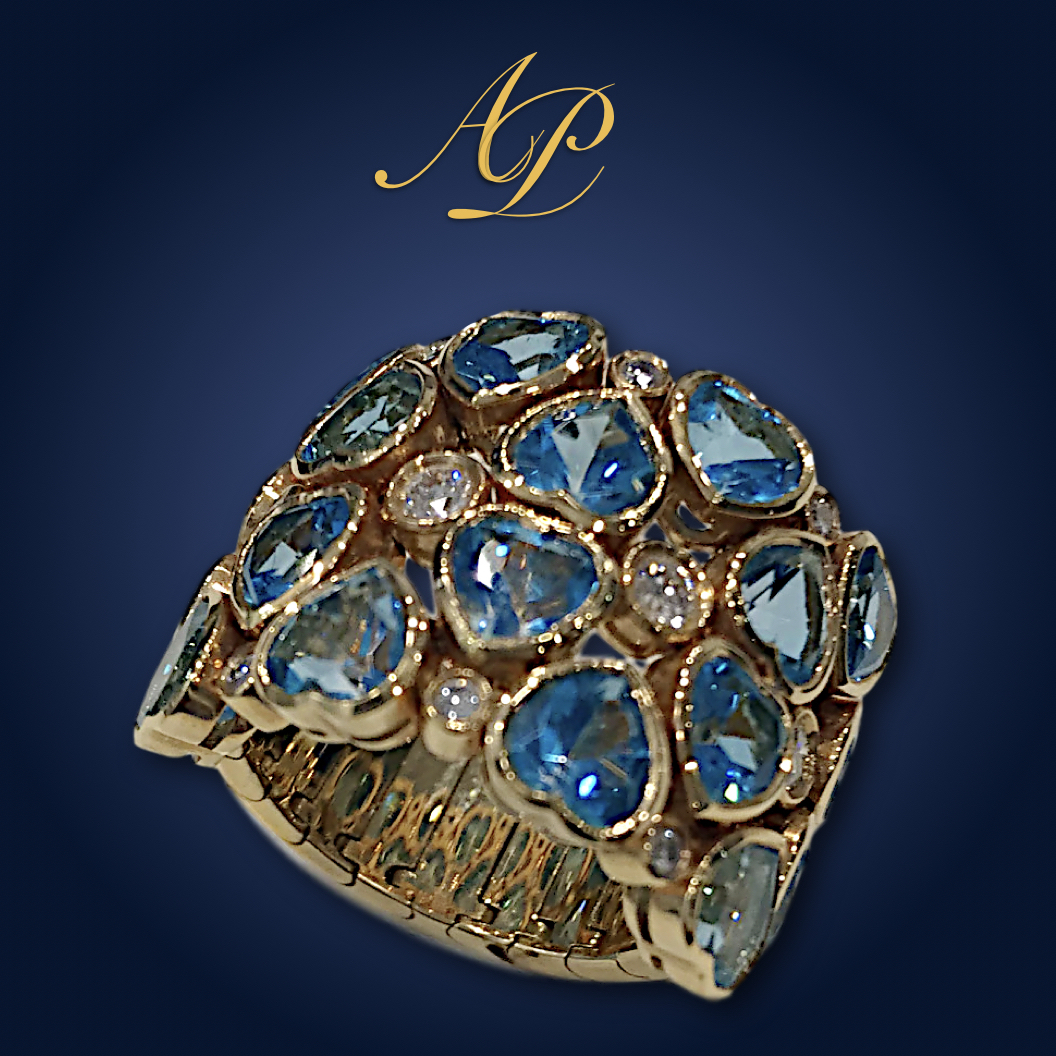 Excellent design of this ring in yellow gold with mongol topaces and diamonds. Flexible mounting pieces.